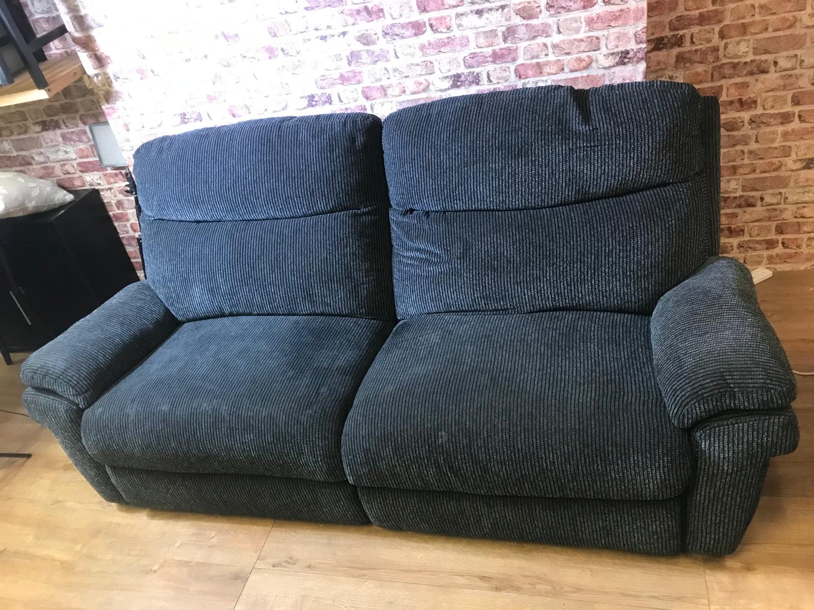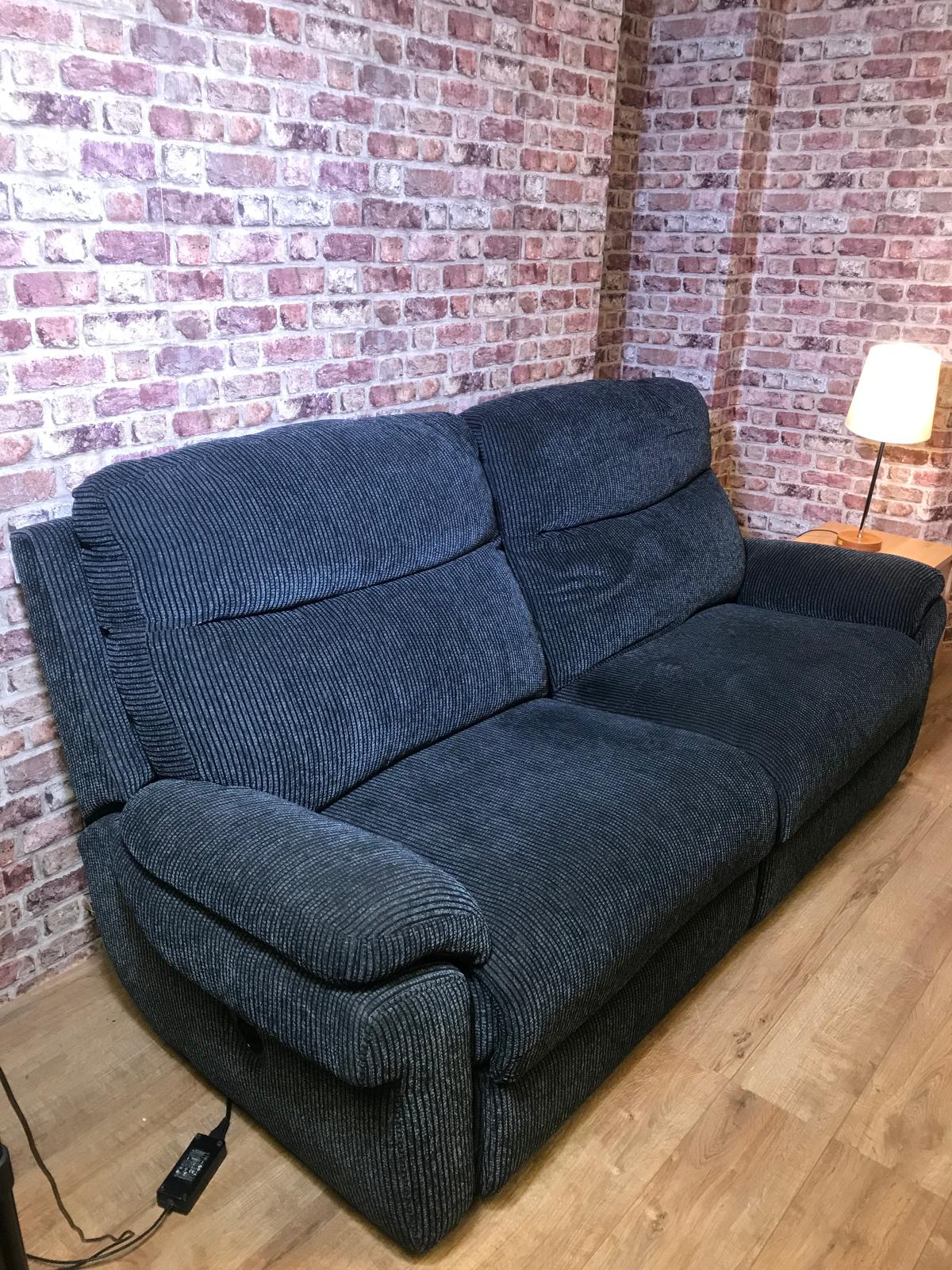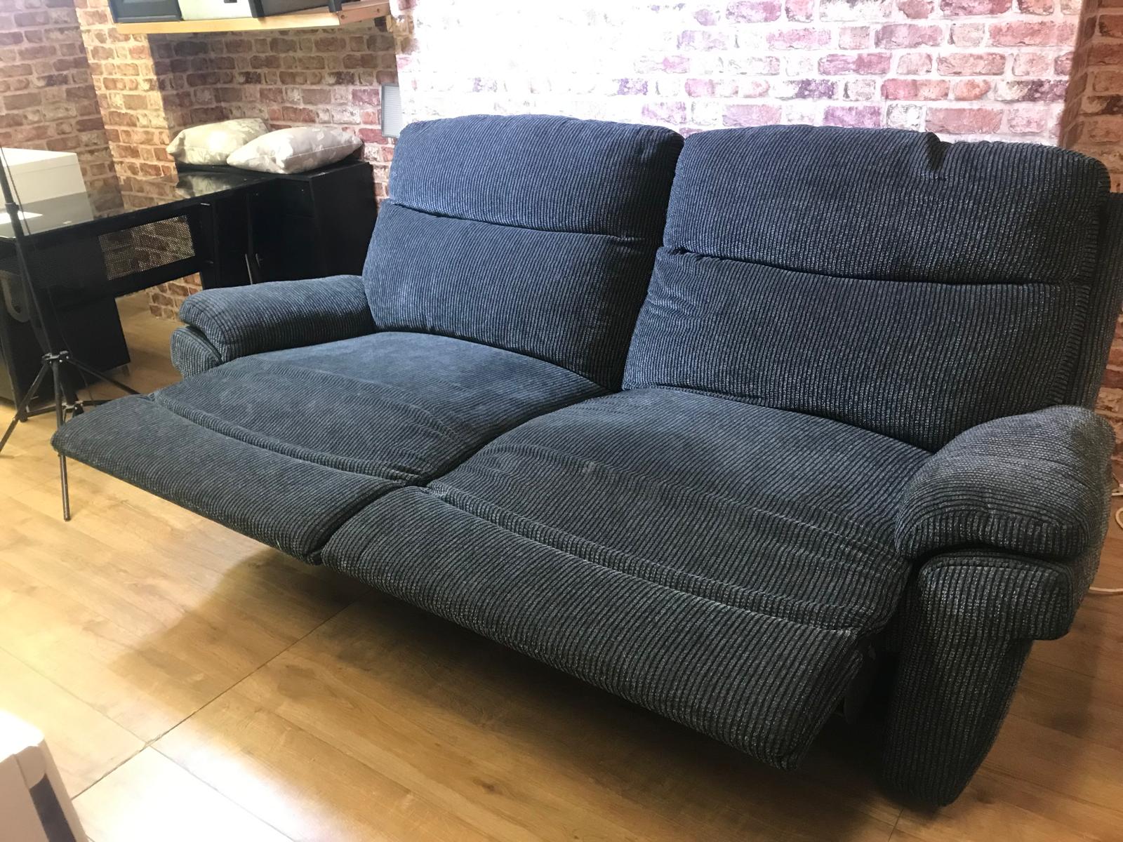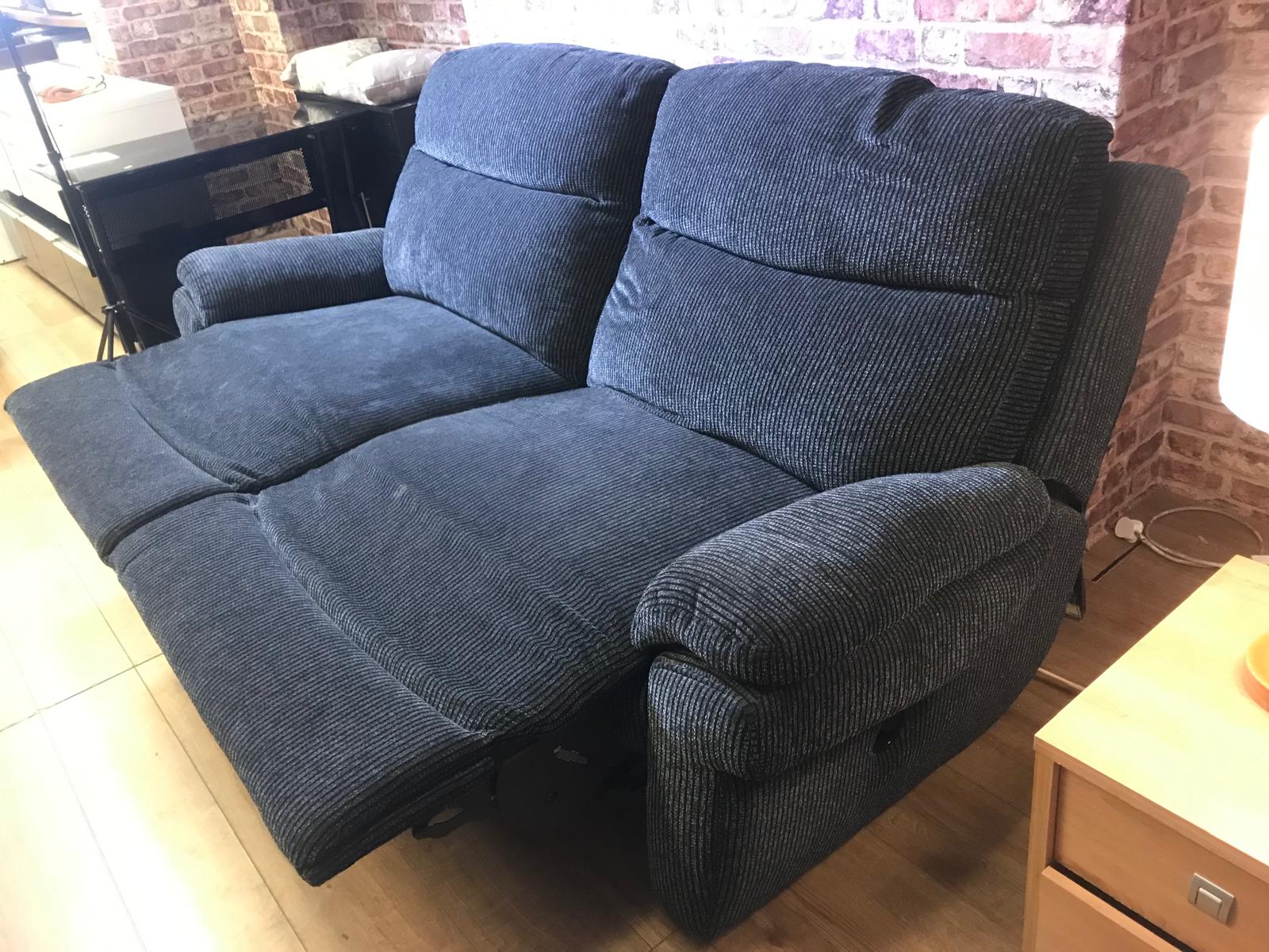 Comfortable blue fabric 2-seater recliner sofa with smooth reclining function.